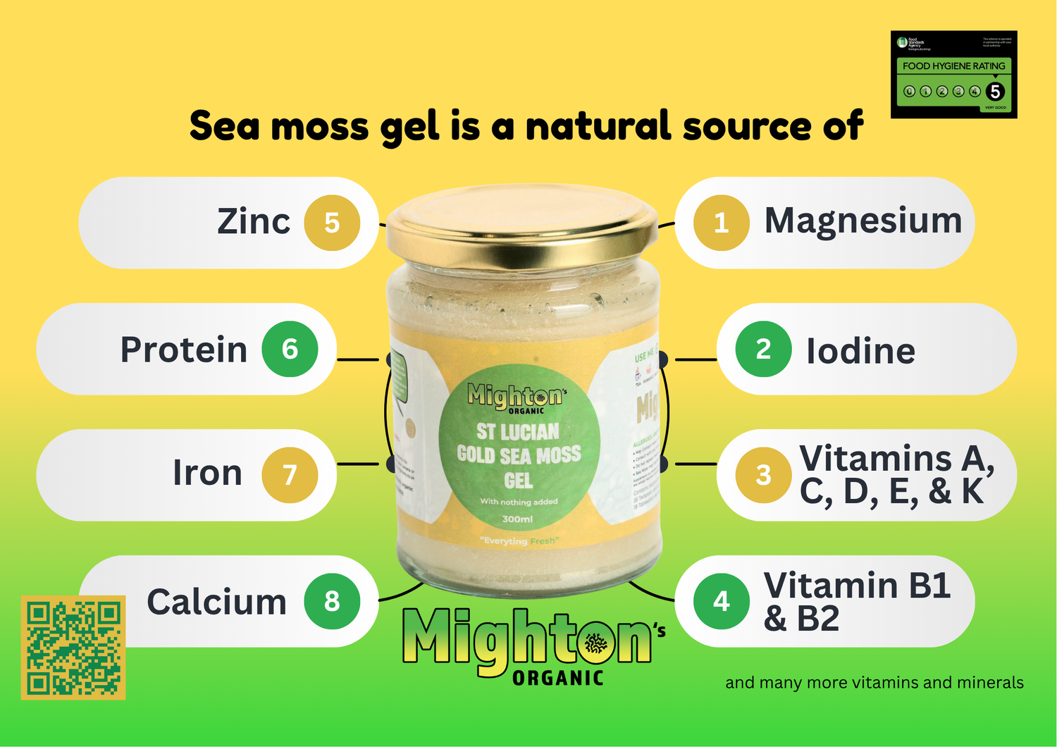 Sea Moss contains 92 out of the 102 minerals that the body needs to function such as Iron, Zinc, Calcium and Magnesium it is also rich in vitamins such as vitamins A, B2, B12 and More!